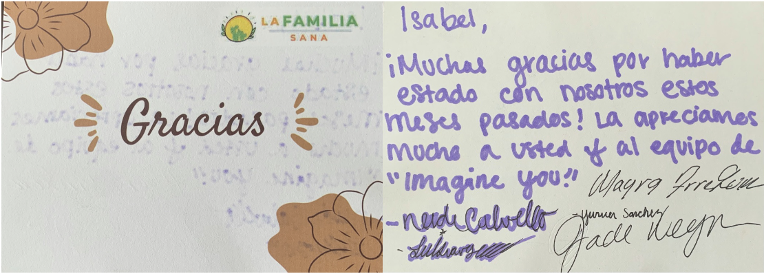 The Imagine You Training was presented in Spanish to La Familia Sana staff as part of a pilot project supported by the Healthcare Foundation of Northern Sonoma County. La Familia staff serve their community in a variety of ways as promotores de salud, community organizers, hosts of educational events, and more. One La Familia Staff member said: