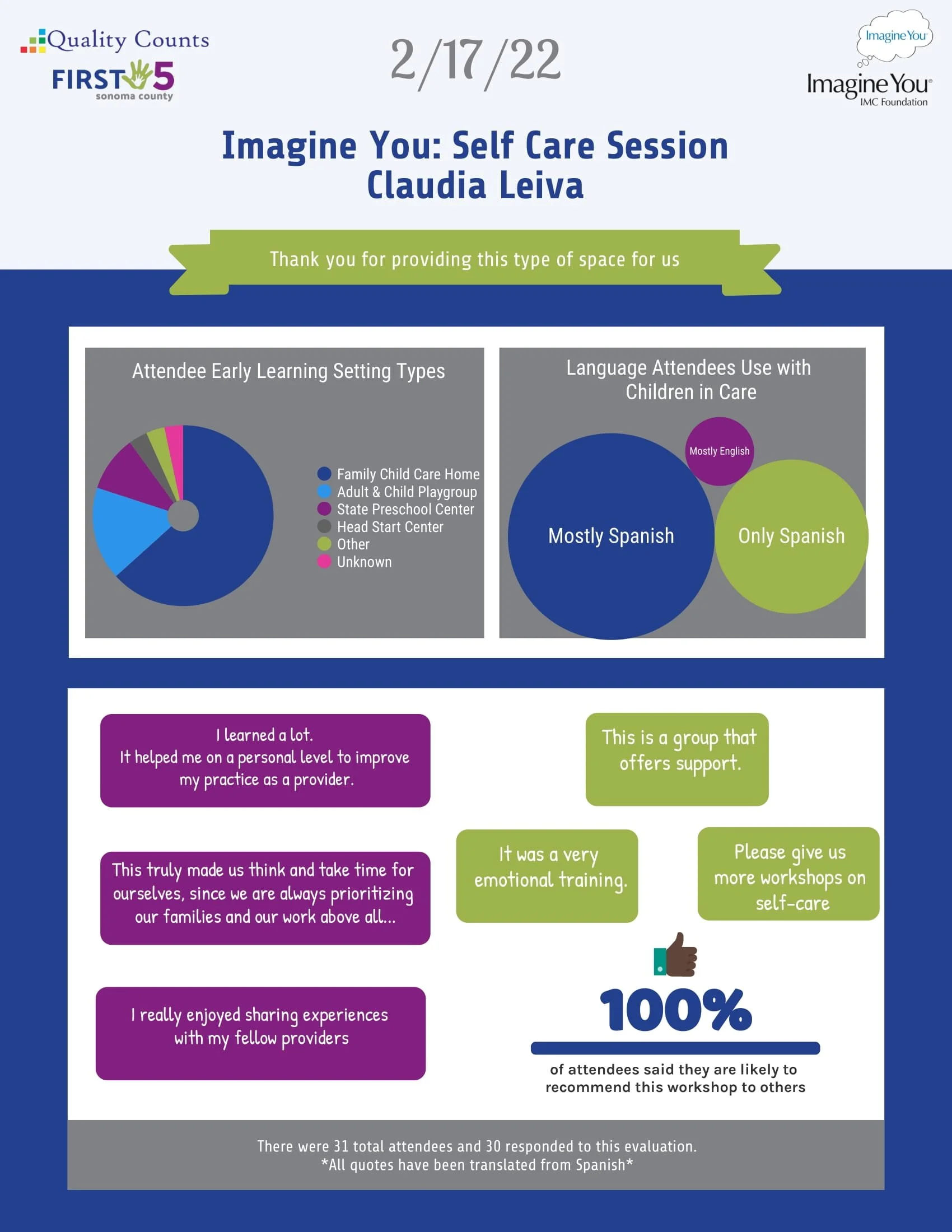 Imagine You was happy to partner with First 5 Sonoma to provide two trainings in Spanish to a wonderful group of First 5 Early Learning Providers. Participants consisted of staff from state preschools, Head Start, Child Care Homes, and Child Playgroups. Participants reported satisfaction with the training objectives, with all providers saying that they were likely to recommend the workshop to others. One participant reported that “This truly made us think and take time for ourselves, since we are always prioritizing our families and our work above all.” First 5 Sonoma also provided Imagine You with a great infographic depicting program participants and findings. Thank you First 5 Sonoma County for your participation and partnership!